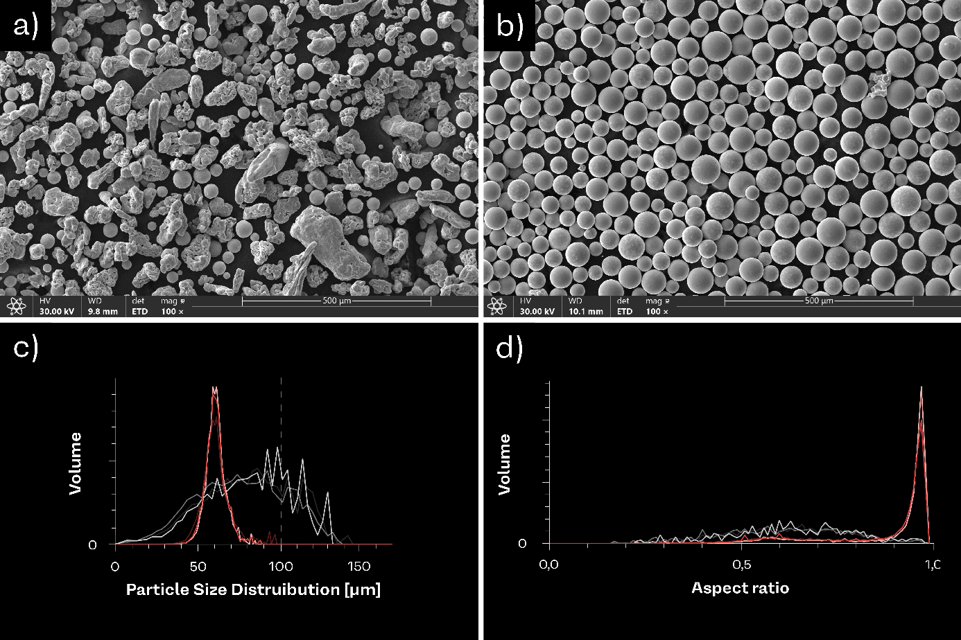 Figure 2 Atomization of TiMo alloy via Powder2Powder technology a) feedstock material – blend of pure Ti and Mo elements, b) as atomized TiMo alloy, c) Particle Size Distribution of feedstock and TiMo alloy, d) sphericity of feedstock and TiMo alloy