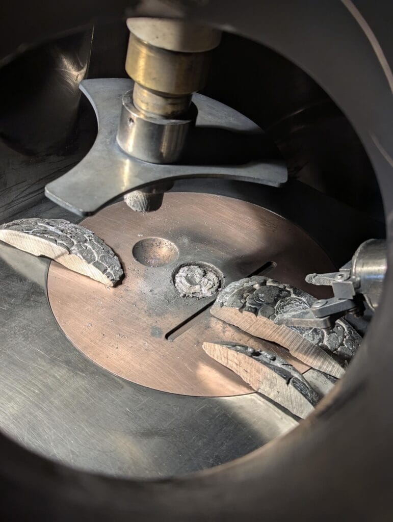 AMAZEMET takes the role of leader of the 1st project, Work Package – Metal Alloy development, which involves defining the requirements for the materials and feedstock. Considering the sustainability aspect, raw elements were used to create 9 custom FeCrAlY alloys with varying content of Cr (10, 15, 20 wt.%) and Al (5, 7.5, 10 wt.%). Raw elements in the form of pellets and chips were used with a purity of at least 99.9 %. Each batch was placed in a homogenization water-cooled copper bowl and melted and homogenized using a focused plasma torch. Increased energy density and gas flow compared to TIG torches typically used in arc melting enhance the efficiency of melting and mixing of elements. The melted buttons were flipped upside down and melted for 2nd time to enhance the homogeneity of arc-melted buttons.